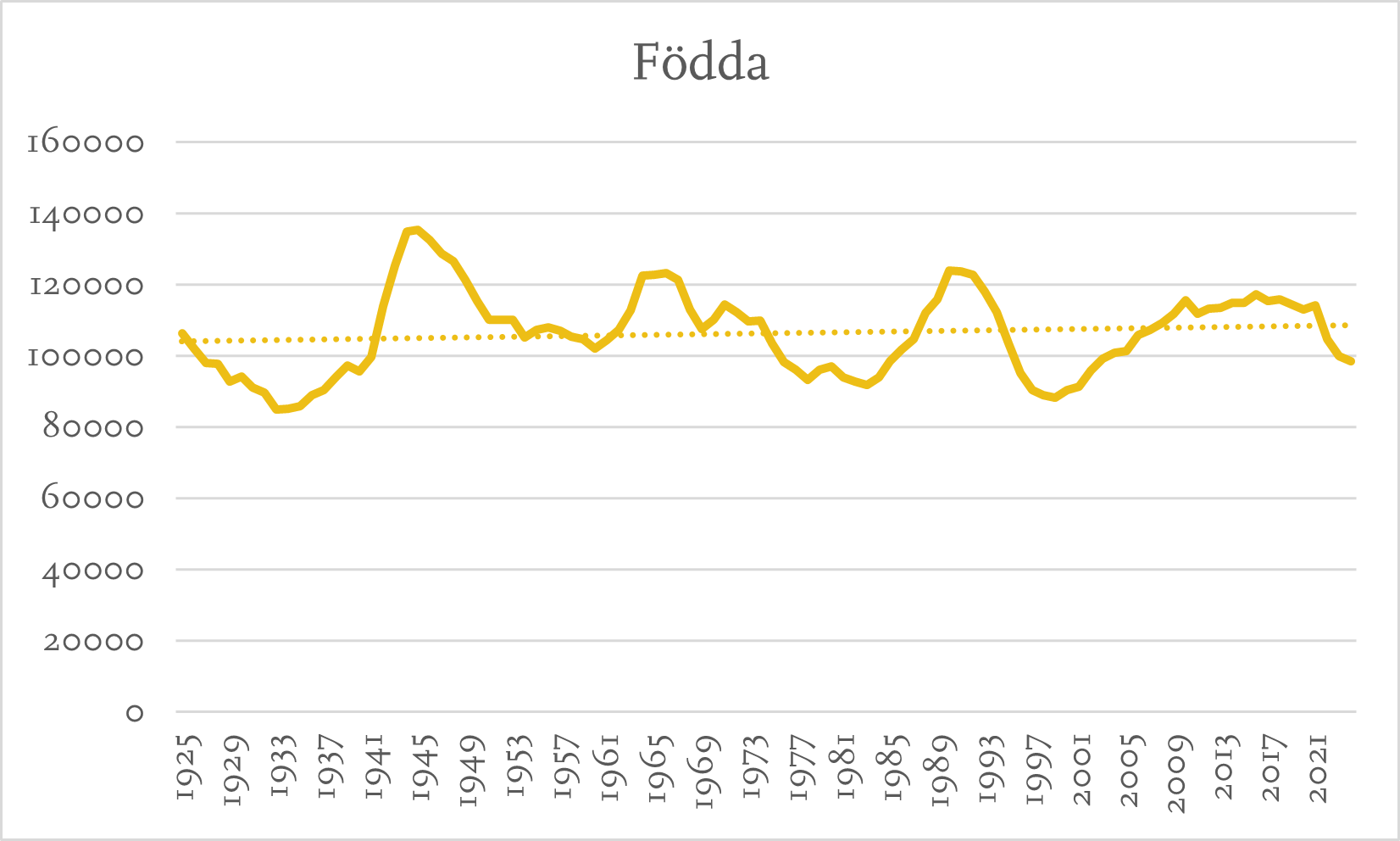 I diagrammet redovisas antalet födda per år under perioden 1925–2024. Det mest slående är de stora svängningarna över tid i antalet födda men där variationen blir allt mindre över tid. Trenden i antalet födda är svagt positiv vilket inte är märkligt eftersom Sveriges befolkning vuxit väsentligt under dessa 100 år.