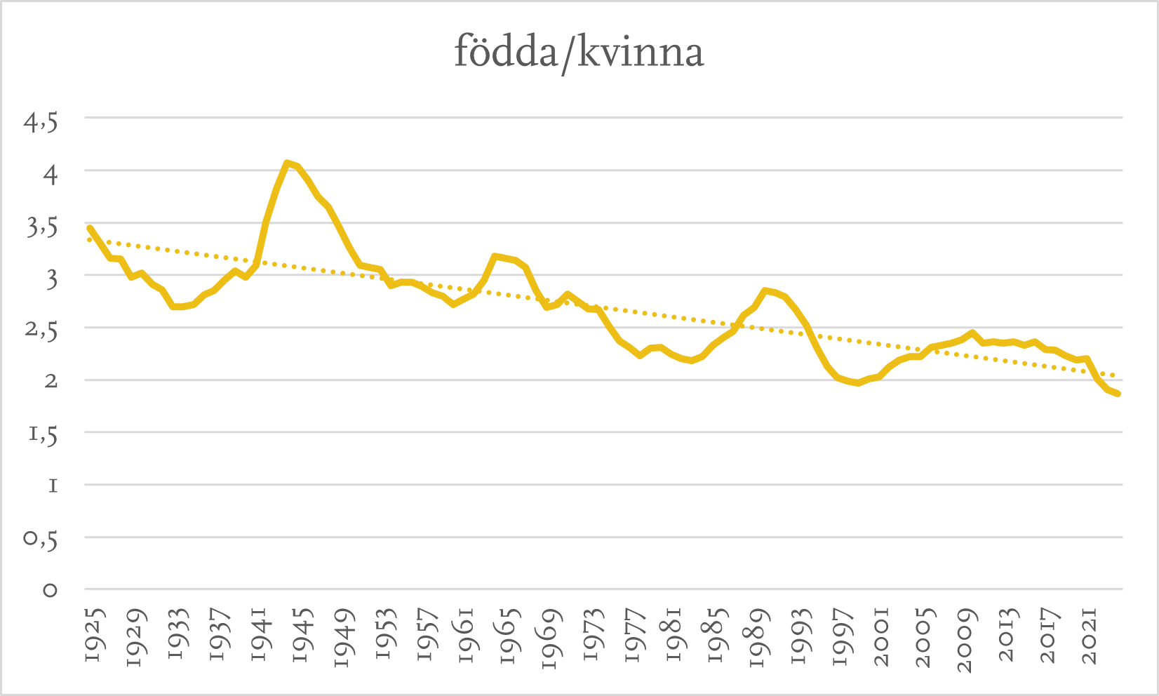 Vi ser att den negativa trenden vad gäller antal födda per kvinna är tydlig för hela perioden 1925–2024. Den negativa trenden indikerar att den statistiska genomsnittskvinnans efterfrågan på barn har fallit stadigt över tid. Den minskade efterfrågan på barn har varit möjlig att realisera genom att kvinnor under den aktuella 100-årsperioden successivt har fått ökad kontroll över sin reproduktion genom ökad tillgång till preventivmedel och friare abortregler. En annan möjlig förklaring är att en större andel kvinnor idag lever i ensamhushåll och vilket minskar förutsättningarna för att skaffa barn.