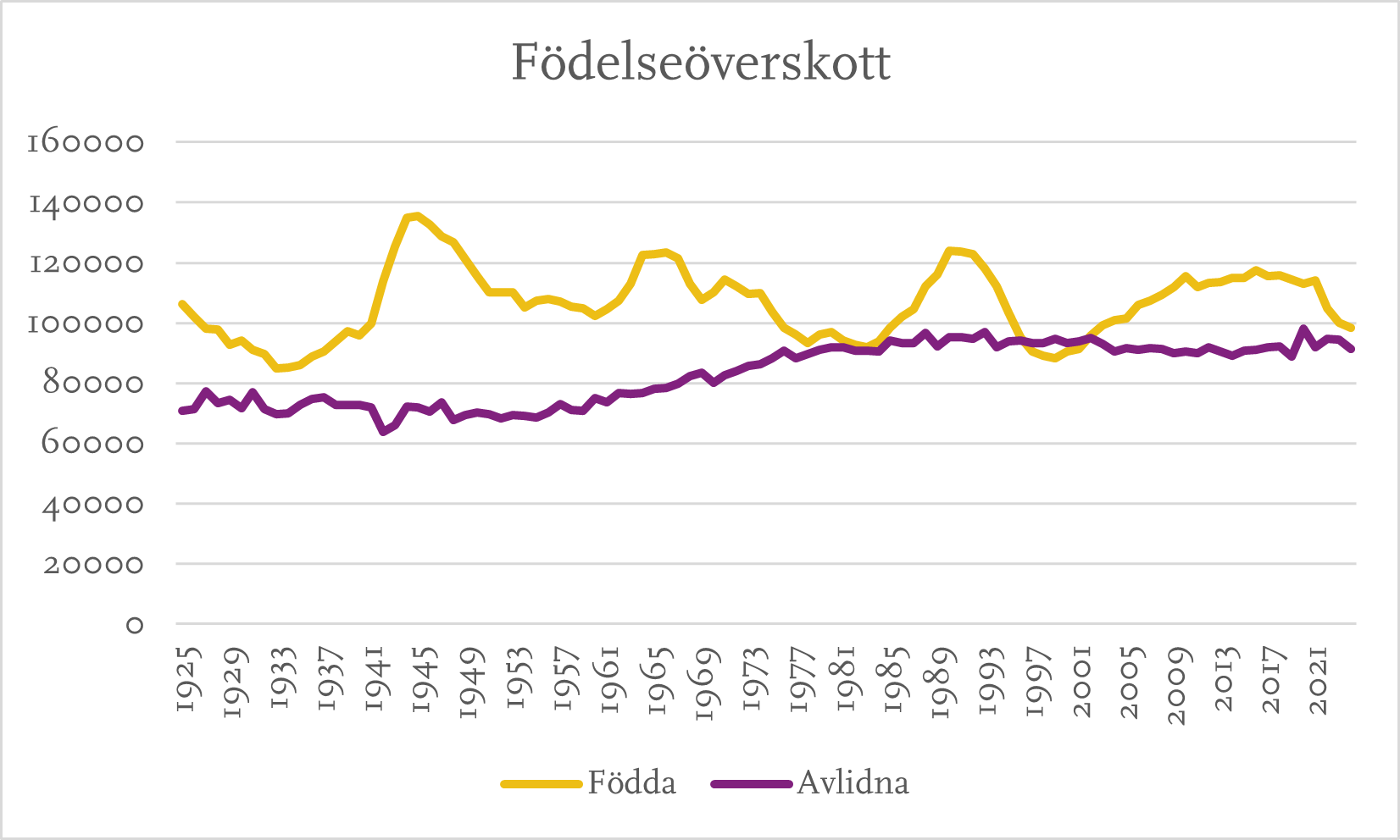 Under 1940-, 50- och 60-talen var den naturliga befolkningsökningen i Sverige hög. I början av 1980-talet var den naturliga befolkningsutvecklingen i stället extremt låg och i slutet av 1990-talet och början av 2000-talet var den till och med negativ. Om födelsetalen på 2020-talet fortsätter att falla, vilket är högst sannolikt, kommer vi snart åter igen in i en fas med en negativ naturlig befolkningsutveckling. Detta är samtidigt under en period när politiken kraftigt dragit ner immigrationen.