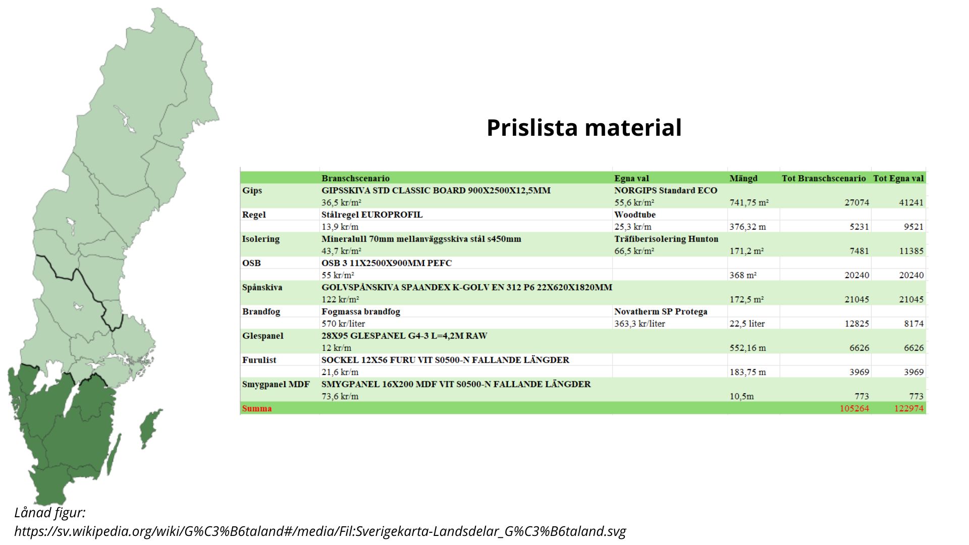 I studien har en klimatdeklaration med schablonvärden från Boverket gjorts med material utifrån ett fallobjekt. Sedan jämfördes EPD:er för att hitta likvärdiga material med lägre klimatpåverkan. Efter att materialen bytts ut gjordes en ny klimatdeklaration för att kunna jämföra utsläppen. Även en ekonomisk jämförelse gjordes med genomsnittspriser från en byggvaruhandel i det geografiskt avgränsade området, Götaland. Tidigare forskning har tagit fram en kostnad för ett ton koldioxidutsläpp, 7 429 kr. Med hjälp av denna kostnad möjliggjordes en ekonomisk jämförelse av klimatpåverkan.