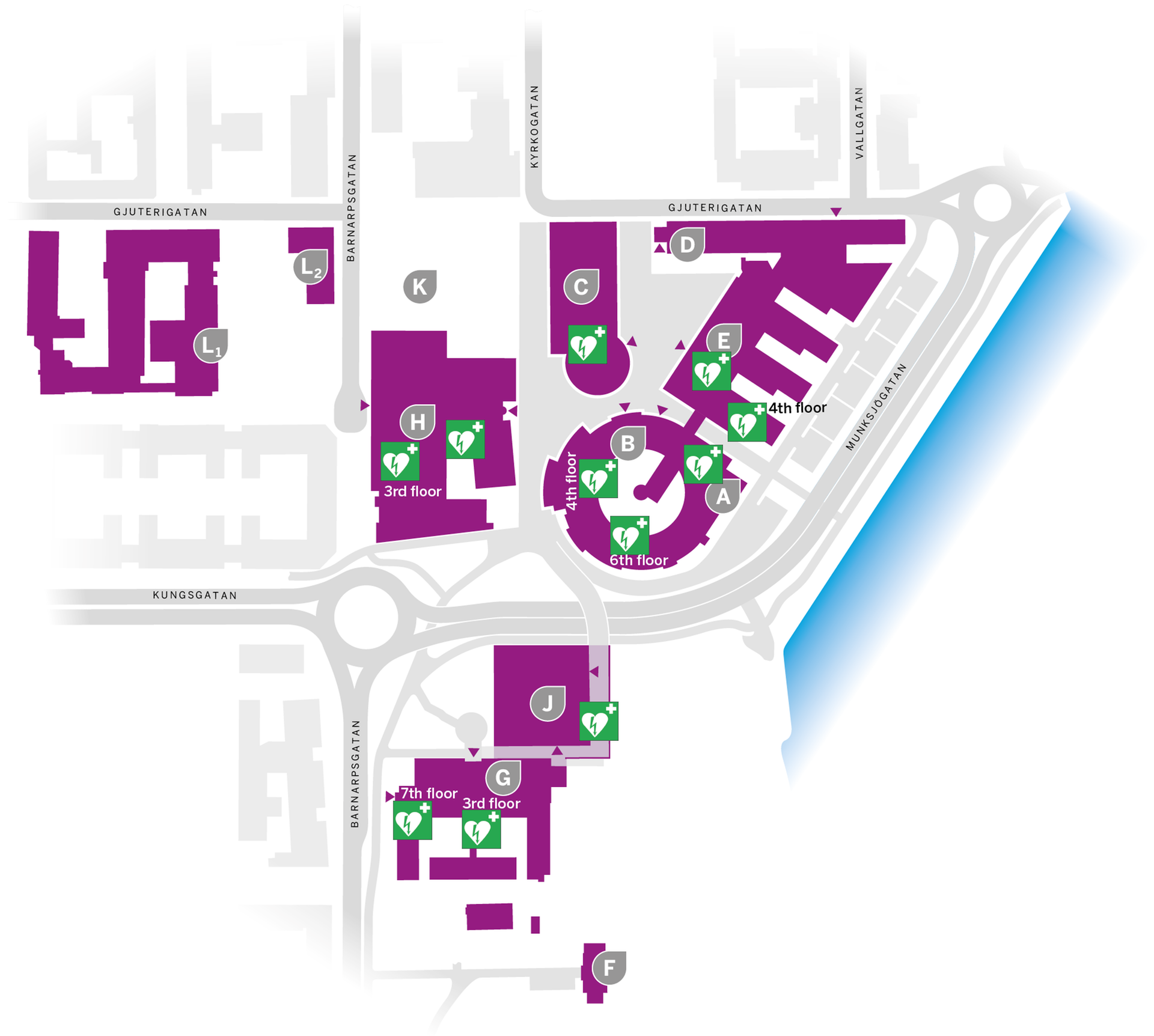 Placering av hjärtstartare på JU Campus. Utrustning finns även i hus K.