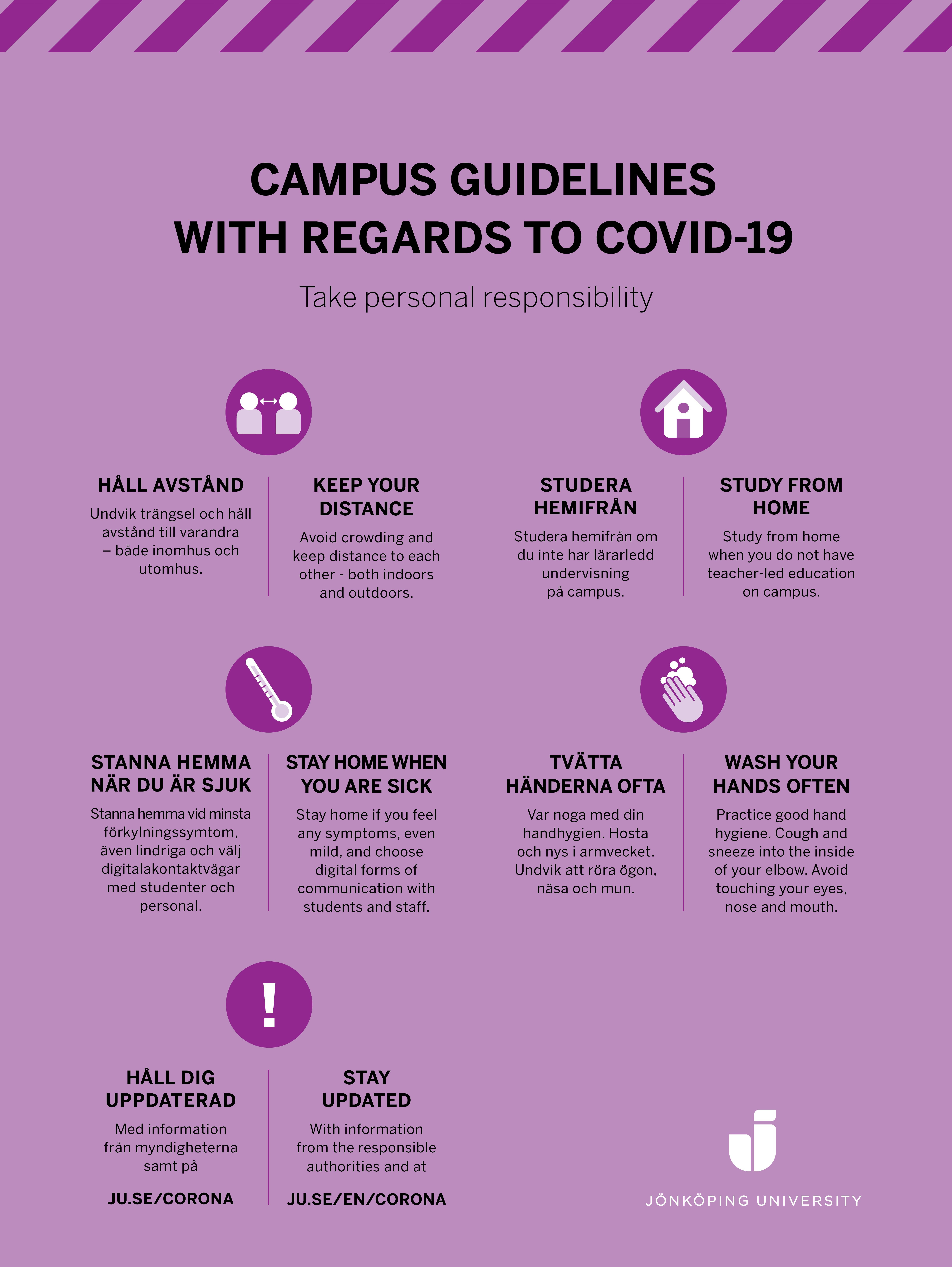 Jönköping University anser, i enlighet med Folkhälsomyndigheten, att individen har ett stort ansvar. Alla måste bidra till att minimera smittspridningen. För att göra detta krävs att man alltid stannar hemma när man har symtom, att man är noggrann med handhygien och att alla håller avstånd till varandra.