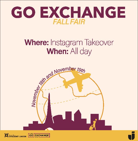 Go Exchange är ett tillfälle att inspirera, dela erfarenheter och ta del av möjligheten att studera utomlands! Den här terminen kommer Go-Exchange att hållas online, fördelat på två dagar 18 och 19 november via Go Exchange Instagram-kontot: @goexchangeju