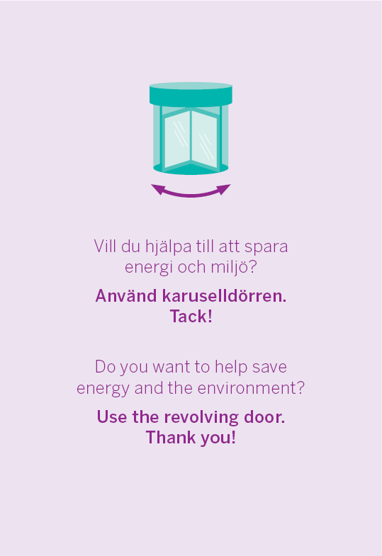 Förutom att använda karuselldörrarna är det mycket som du som anställd/student kan göra för att spara energi och hjälpa miljön. Det handlar till stor del om små förändringar av vardagliga aktiviteter som ger stor effekt om vi alla gör dem: