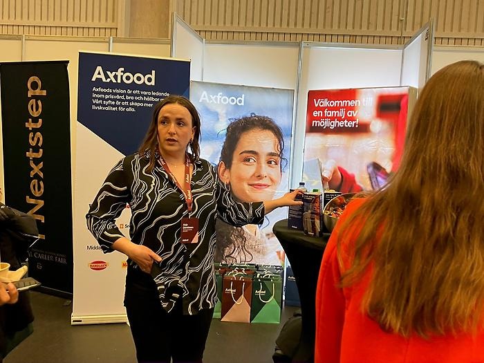 Anja Davidsson, verksamhetsutvecklare på Axfood och alumn från JIBS. ”Mässan har ett jättebra format. Axfood är en stor arbetsgivare och detta är ett utmärkt tillfälle för oss att visa upp oss och få kontakt med framtida medarbetare”.