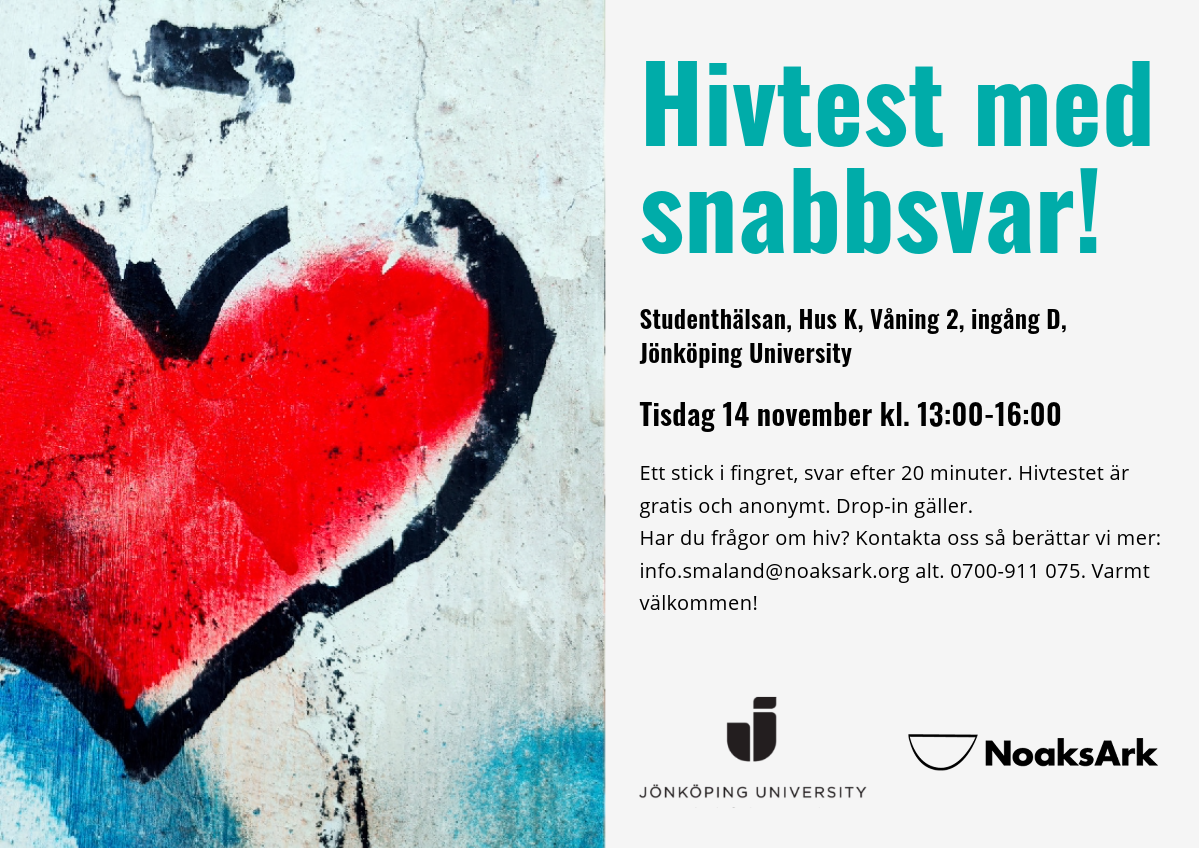Den 14 november kommer Noaks Ark att erbjuda JU:s studenter att ta snabbsvarstest för HIV.