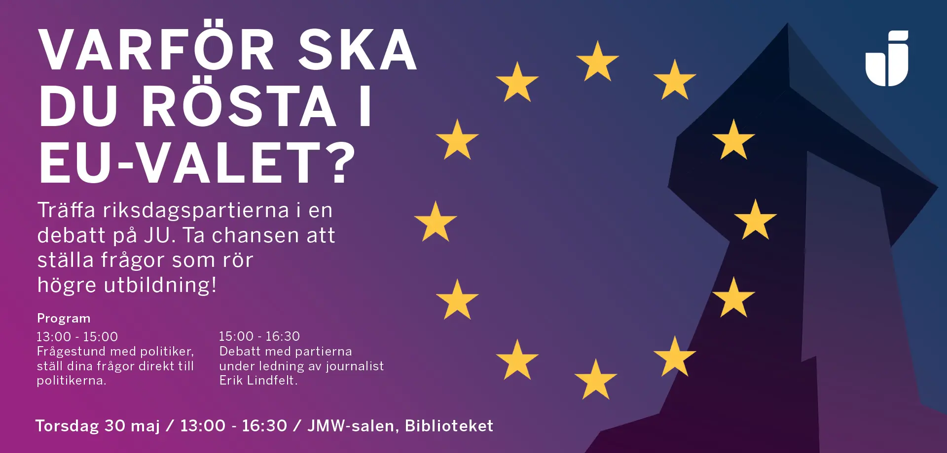 Torsdagen den 30 maj anordnar Jönköping University en valdebatt inför EU-valet 9 juni. Under eftermiddagen kan studenter och personal träffa riksdagspartierna i JMW-salen på biblioteket. Senare blir det en debatt där journalist Erik Lindfelt intervjuar partierna. Ta chansen att ställa frågor som rör dig som student!