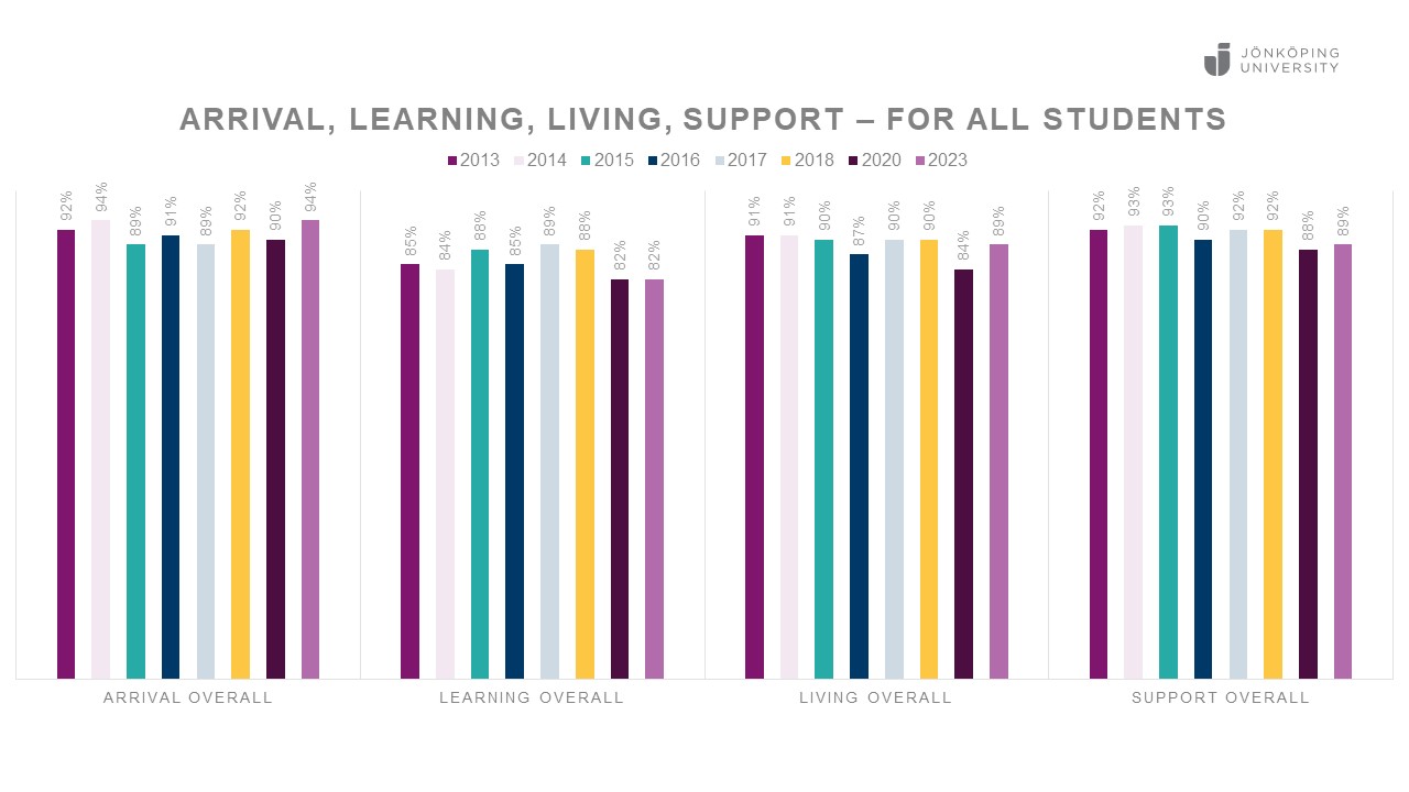 Sedan 2013 har Jönköping University genomfört ISBSB, internationella studentbarometern (ISB) och nationella studentbarometern (SB), åtta gånger. Nedan är några av resultaten från den senaste undersökningen.