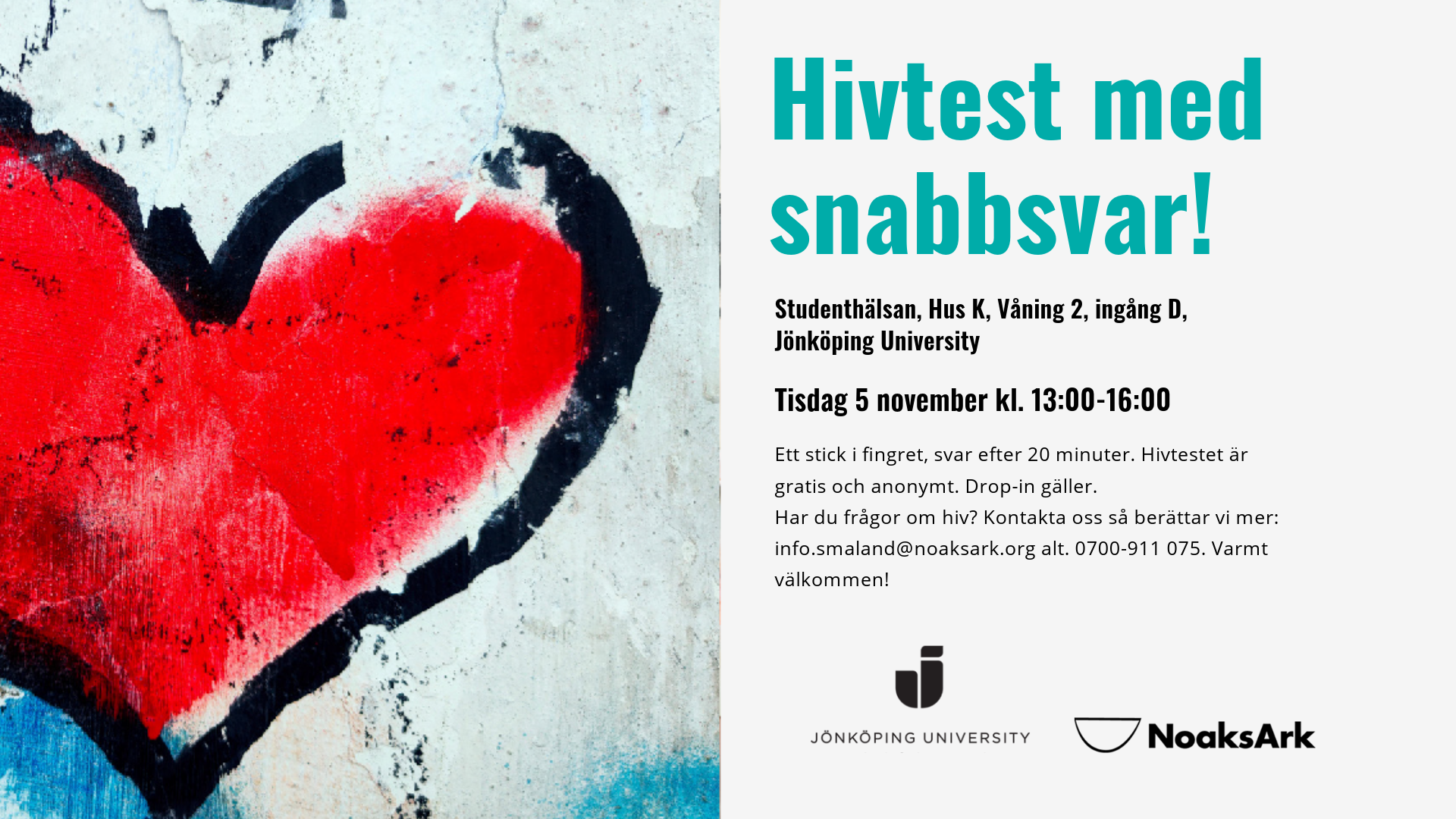 Den 5 november kommer Noaks Ark att erbjuda JU:s studenter att ta snabbsvarstest för HIV.