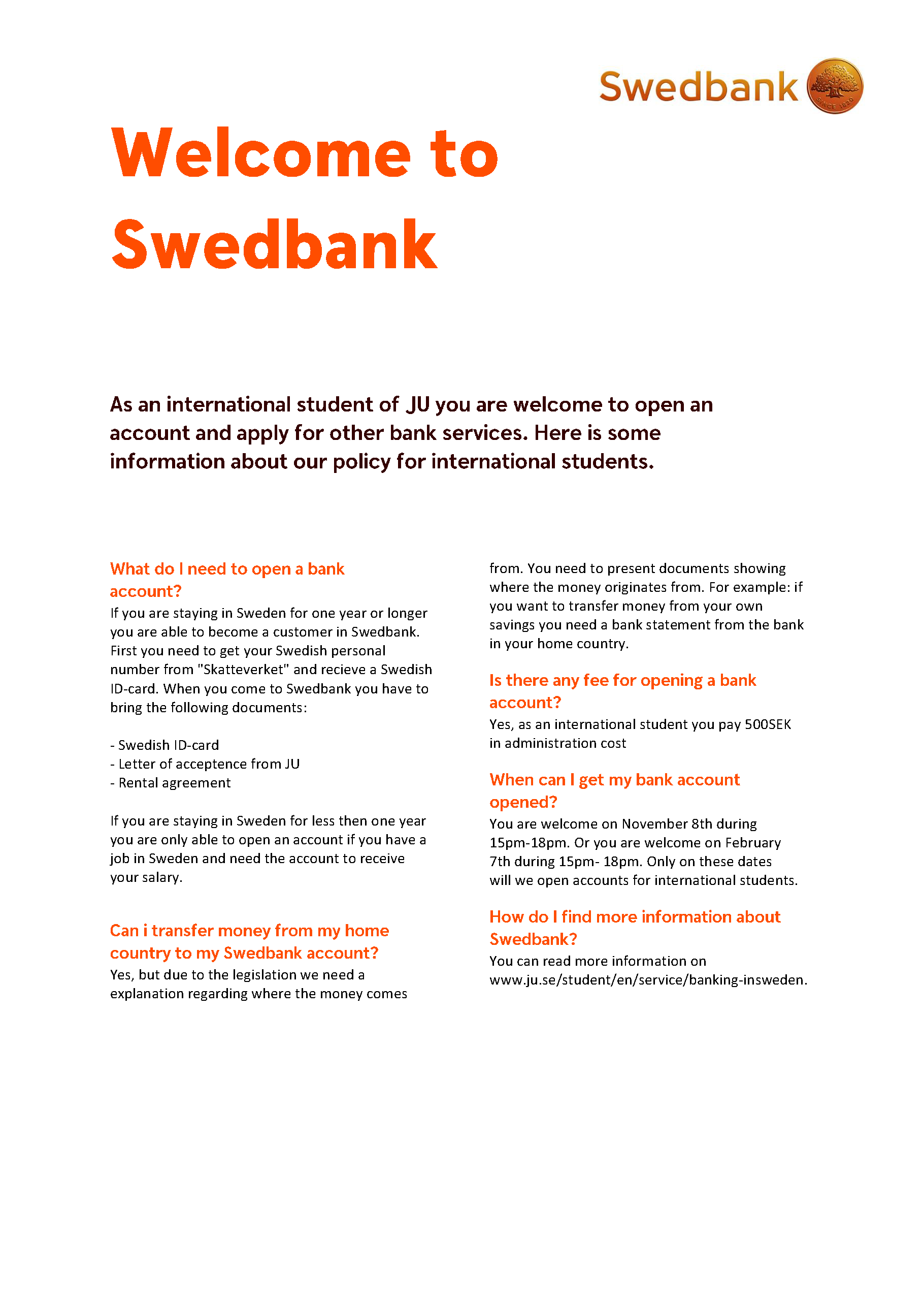 If you are staying in Sweden for a longer period it will be much easier for you to manage your day-to-day financial matters, such as paying you rent and other bills, if you have a banking relationship with a Swedish bank.